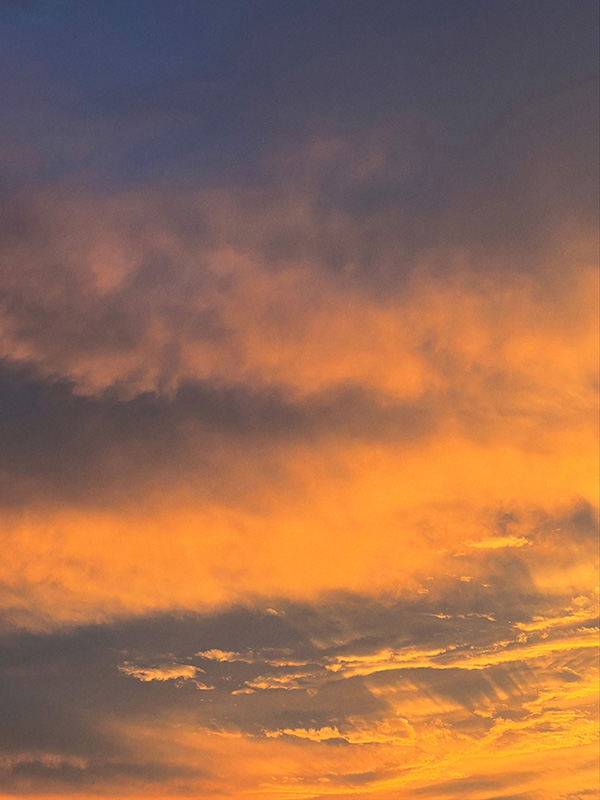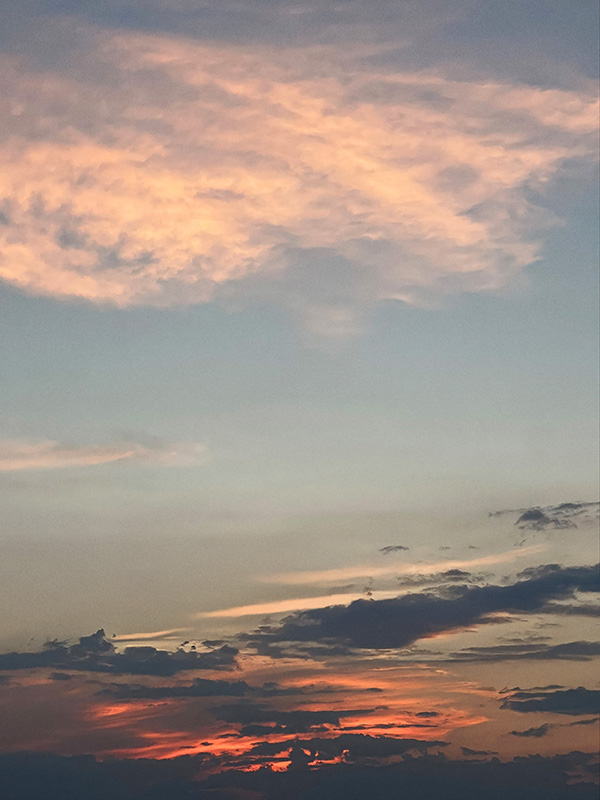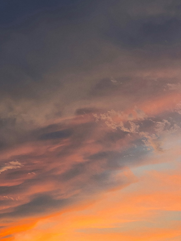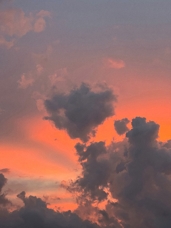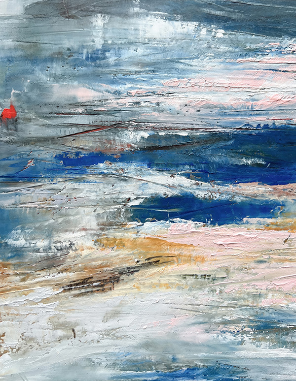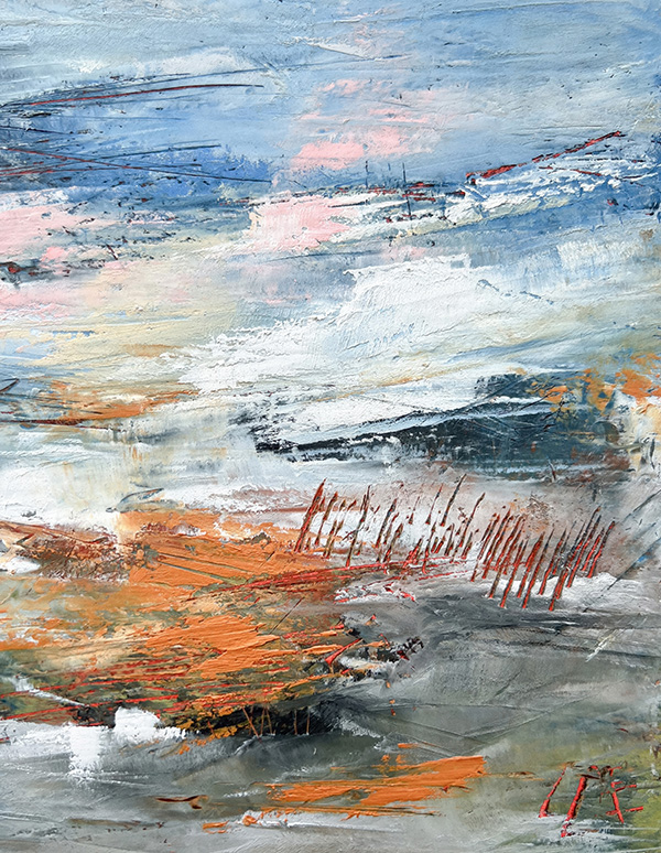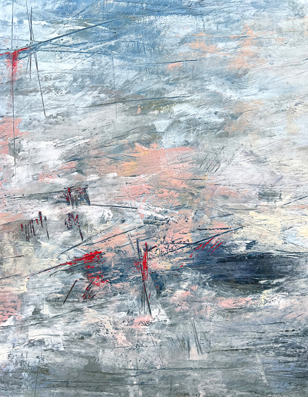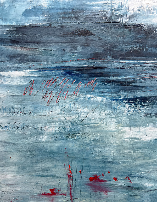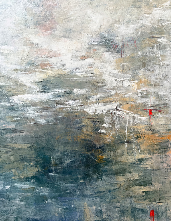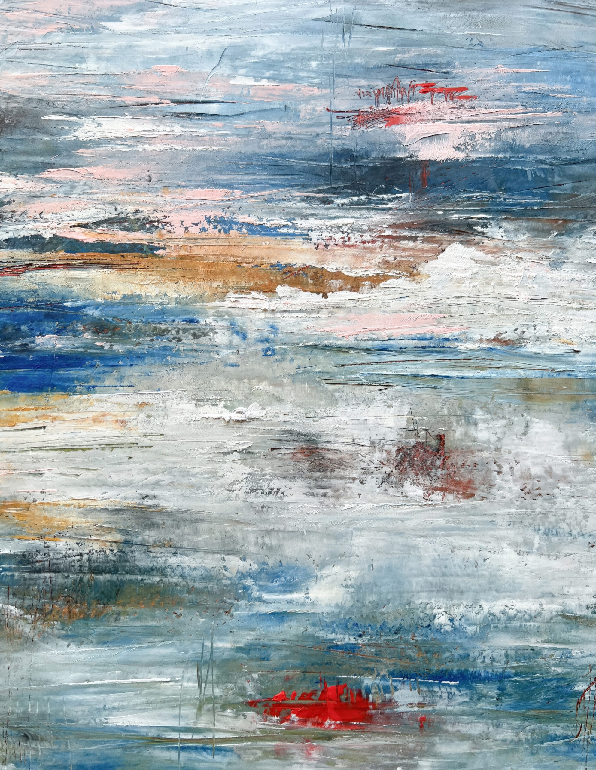 The photographs in this collection do something different but equally necessary—they document the actual skies that inspire these emotional landscapes. Gradient sunsets transitioning from teal to coral. Storm systems gathering on distant horizons. Fog rolling across water at dawn. These are the real atmospheric moments, offering serene backgrounds for meditation, for breath, for the pause we so desperately need in this busy world. But while the photographs freeze specific moments, the paintings go deeper—scratched marks and weathered surfaces showing layers upon layers of color and memory and emotion, red accents punctuating like lightning or questions, horizontal sweeps suggesting horizons where sky meets earth meets everything we can’t quite articulate but somehow recognize.